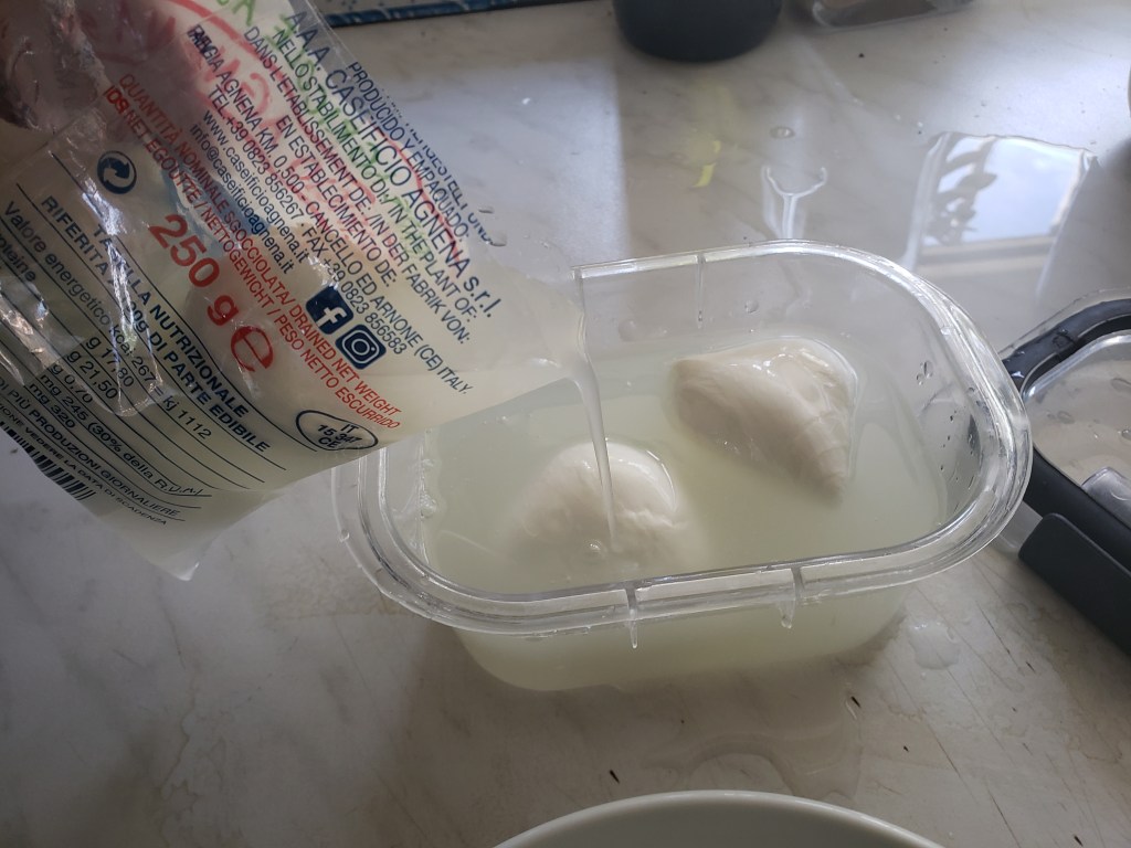 Here’s what I have learned: Mozzarella that is sold for transport must have a longer shelf life.  To do that, they must reduce the moisture content.  Every bag of mozzarella I had bought in America always said “low-moisture content”.  I always found that odd, since none my other cheeses wasted their packaging real estate going on about moisture.
